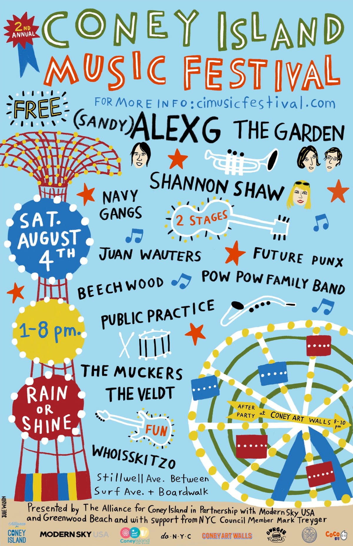 One stage will be at the boardwalk entrance on Stillwell Avenue and the other will be located at Coney Art Walls. Along with enjoying the music, attendees can check out the murals, sample fare from various food vendors, play life-sized games (Jenga, Connect Four), and of course, go on the famous amusement park rides.