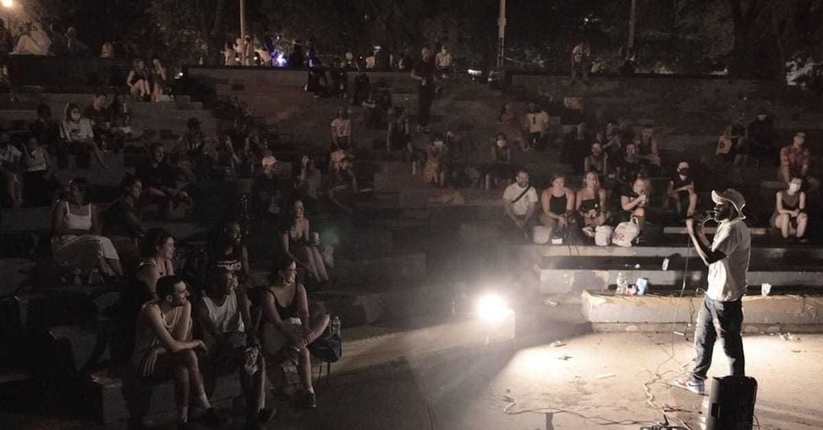 On a recent luke-warm night, in an undisclosed outdoor location in Brooklyn, an audience of a little over a hundred people sat on an expanse of concrete steps and watched a comedy show. The stage was an area of cement with a single light bulb and a PA system powered by a car battery. The comedians’ vulgarities ricocheted off nearby trees and mixed with the soft yelps of a group of boys playing basketball nearby.