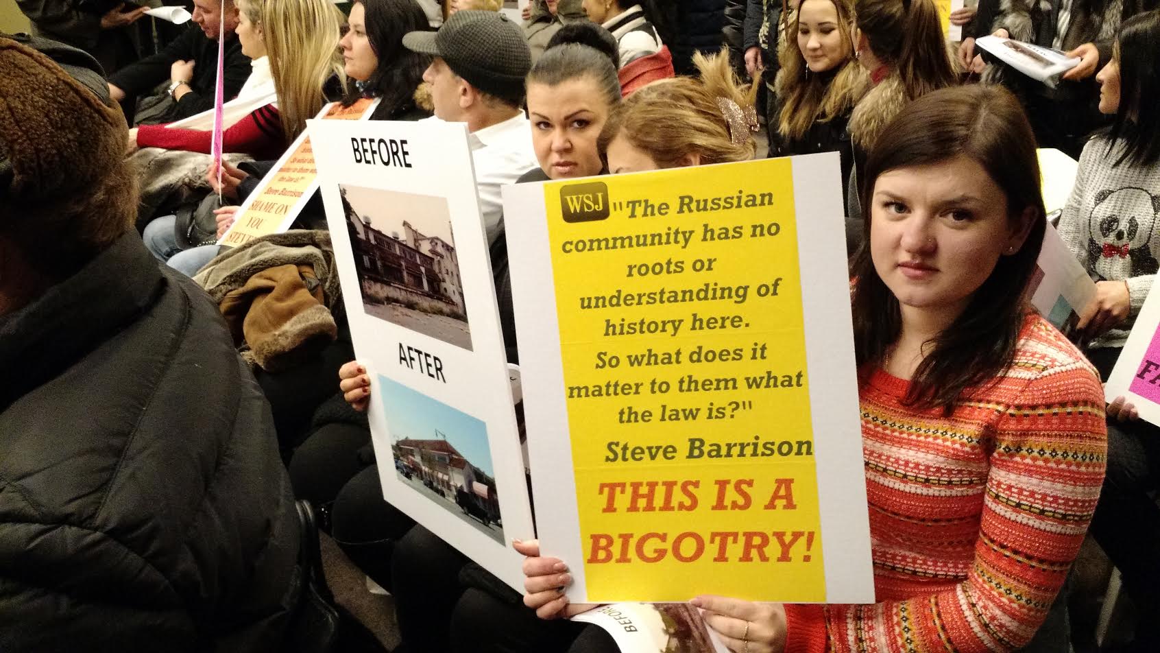 Cherry Hill supporters also depicted it as a civil rights battle, saying the market’s opponents – especially Bay Improvement Group President Steve Barrison – want them out because they’re Eastern European. Many held signs baring a 2011 quote from Barrison in which he suggested to a Wall Street Journal reporter that the Russian community gives Cherry Hill a pass because they have “no roots or understanding of history here.”