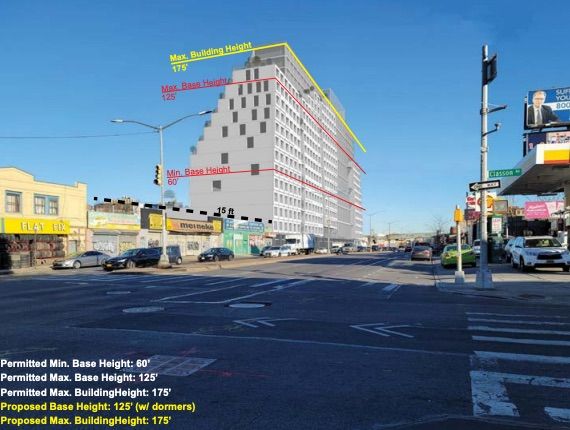 The march of potential large development along broad Atlantic Avenue in Central Brooklyn continues, with Atlantic Brooklyn LLC, whose owners are not publicly known, proposing a 175-foot tall, 370-foot wide building on the avenue’s north side between Classon and Franklin avenues, in the southwest corner of Bedford-Stuyvesant.