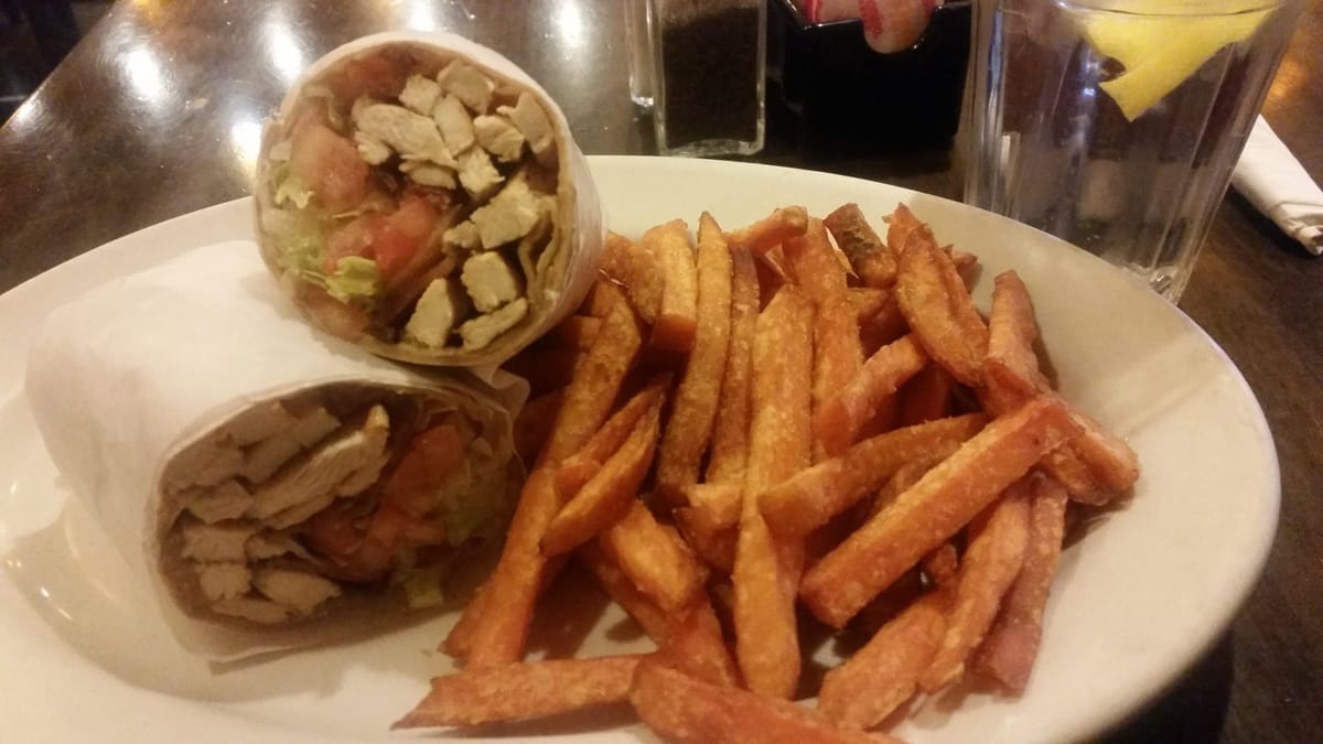 The wrap is practically overflowing with tender chunks of chicken topped with a generous layer of lettuce and chopped tomatoes, giving every bite a satisfying crunch-meets-juiciness. The sweet potato fries are equally balanced, with a lightly crispy outside and soft inside that doesn’t try to hide it’s origins as an awesome sweet potato. The portion size is large enough that you can save half of each for later and, no surprise, they hold up amazingly well the next day.