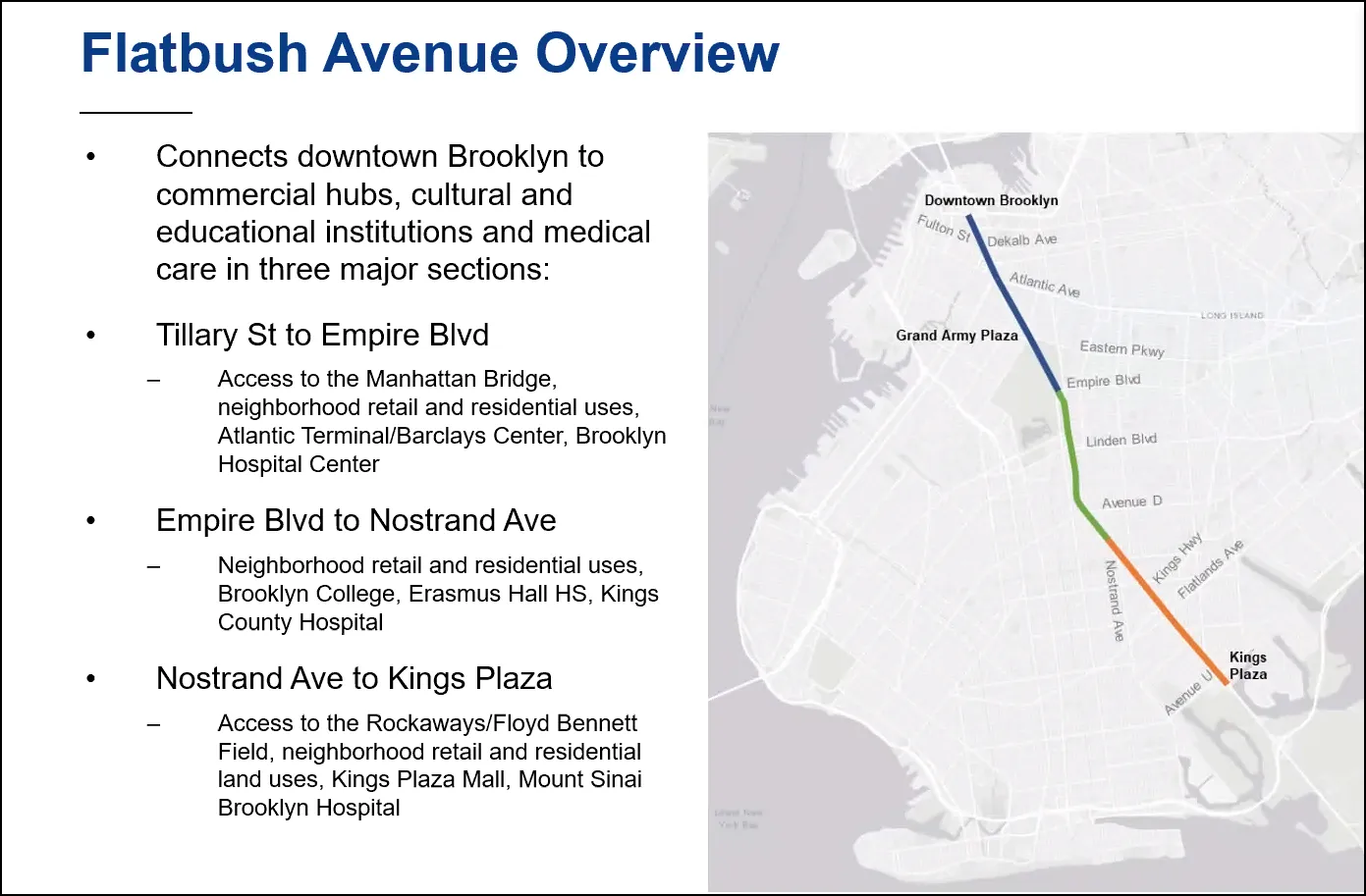 - While "The DOT and MTA didn't present any hard-and-fast plan to fix the problems with Flatbush Avenue, [..] the presentation on the seven-mile stretch of road made a case for drastic interventions," Streetsblog summarized the Flatbush Avenue bus priority zoom from last week. Here is the full presentation from the event.