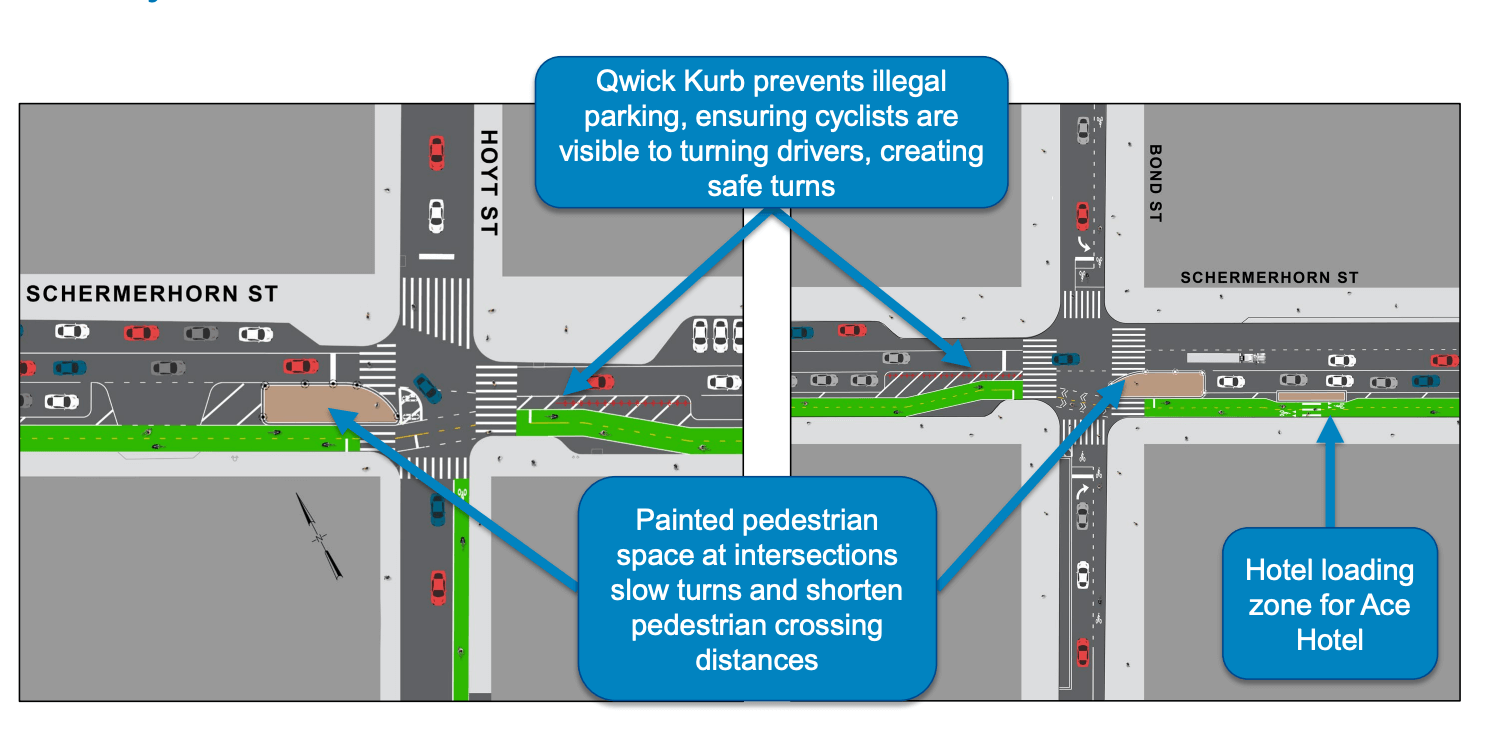 Schermerhorn Street: The city's new plan, set to be implemented in the next few months, will turn Schermerhorn Street between Smith Street and Third Avenue into an eastbound one-way street for vehicles, who will have one driving lane down the center of the street, DOT announced at a Community Board 2 meeting last week, Brooklyn Paper reports.