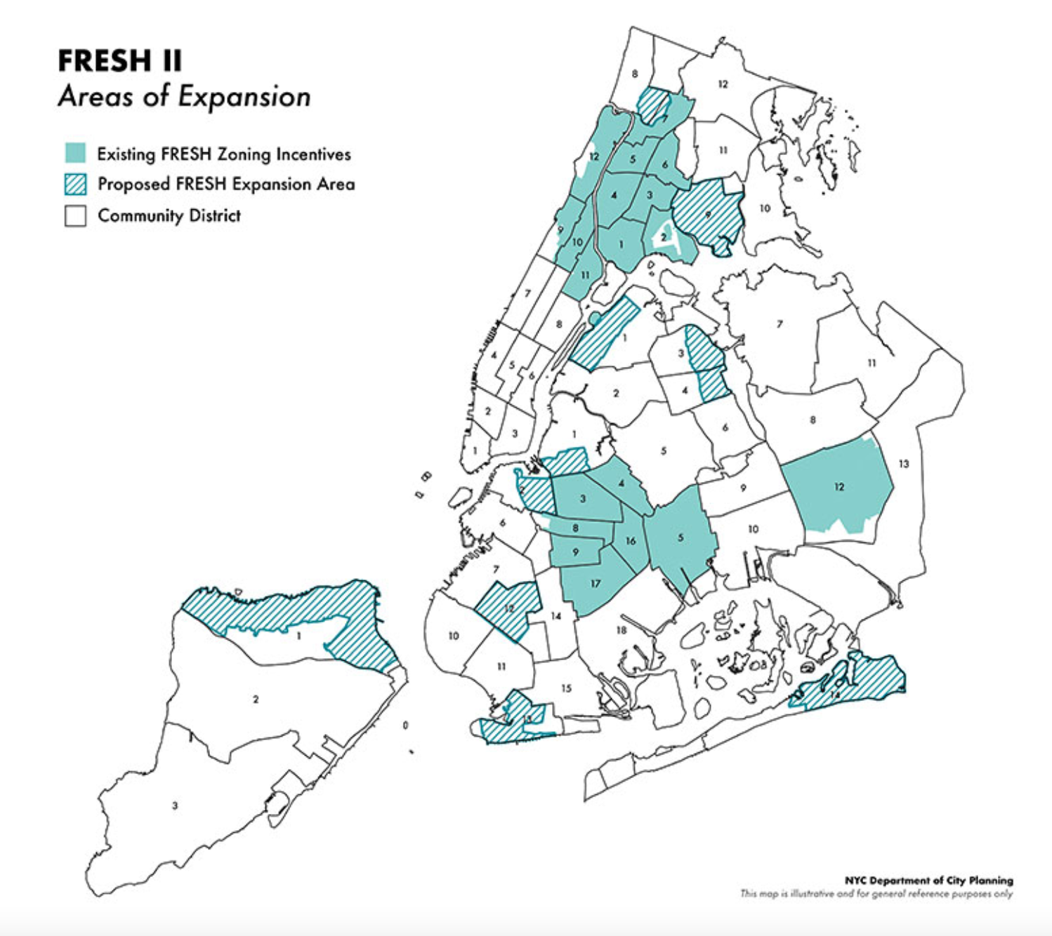 The Food Retail Expansion to Support Health (FRESH) program was first created in 2009, as an attempt to bring more grocery stores to underserved areas and reduce health inequities. The program currently covers a swath of city neighborhoods that includes much of central and eastern Brooklyn. A new map would expand the program to 11 additional neighborhoods across the city, including parts of South Williamsburg, Fort Greene, Borough Park and Coney Island in Brooklyn.