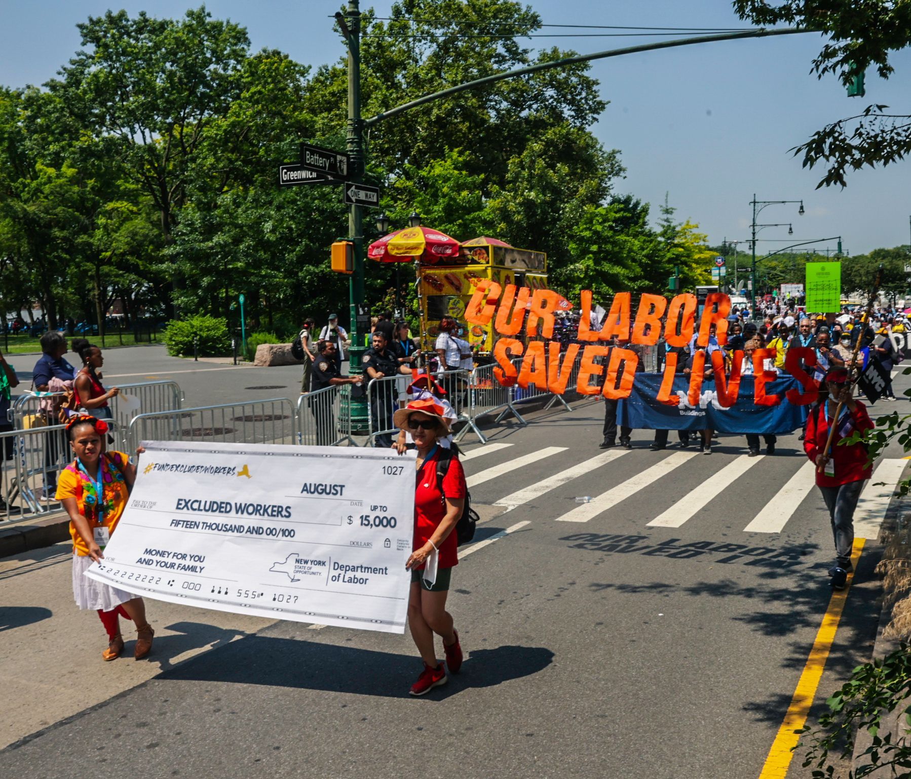Adrian documented the Ticker Tape parade for us. EMS/EMT workers were notably absent, justly upset over the ridiculously low wages they are being paid, while undocumented workers were out in force promoting the funds that are finally heading their way in August.