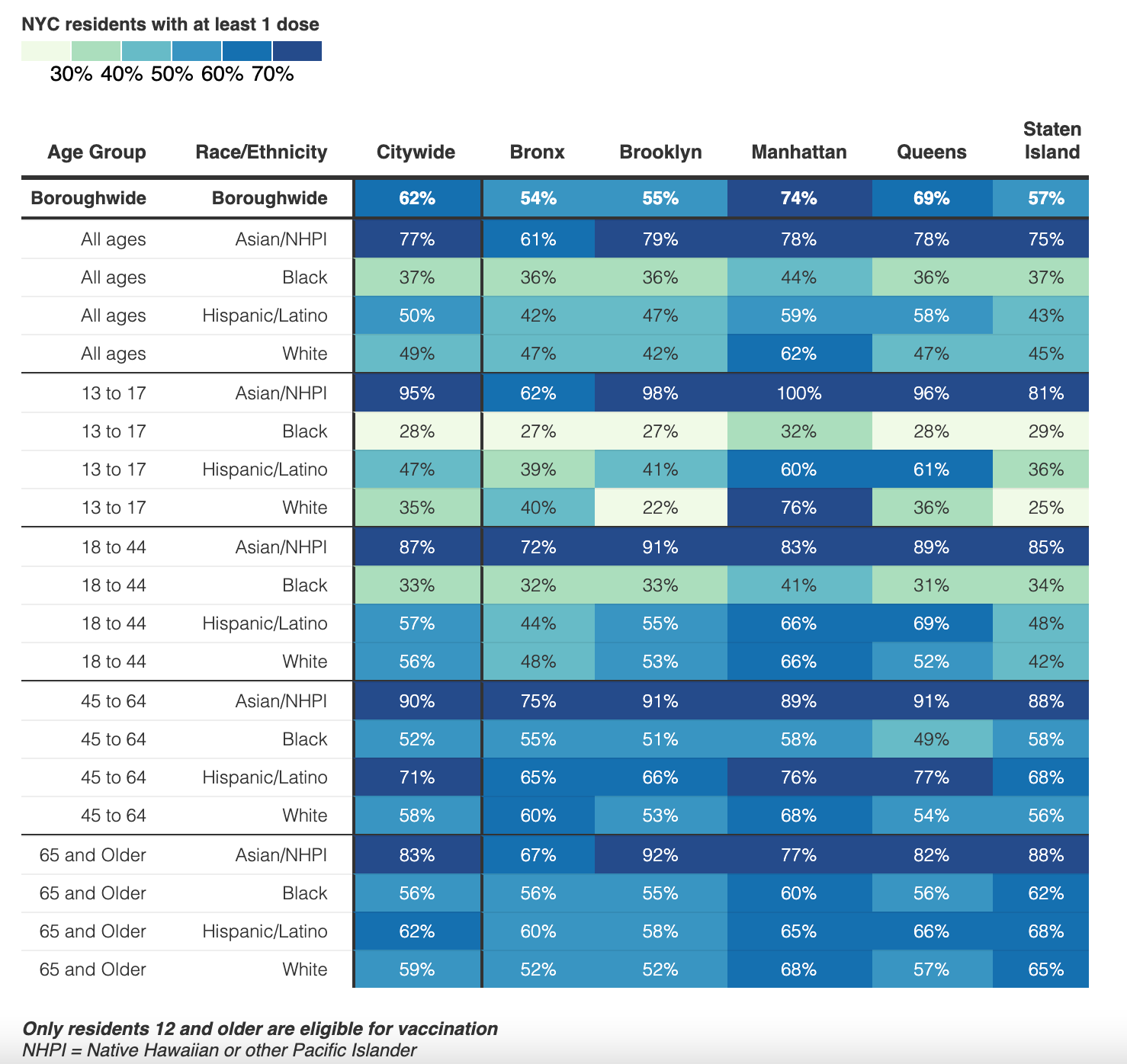 Brooklyn is also home to the greatest number of unvaccinated elderly (65+), deemed to be the most vulnerable to COVID-19, with just 52% of white, and 55% of Black residents recorded as having received at least one shot of a vaccine.