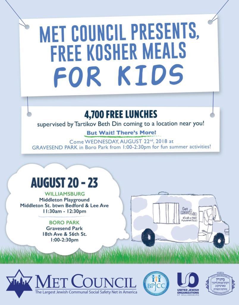 “Met Council is proud to have the only free kosher summer lunch program for kids in New York,” said David G. Greenfield CEO of Met Council. “We give out free kosher lunches during the week between when camp ends and yeshiva begins to ensure that all children have access to nutritious meals. There’s no catch, just show up with your child and get a free kosher lunch for every kid that’s there!”