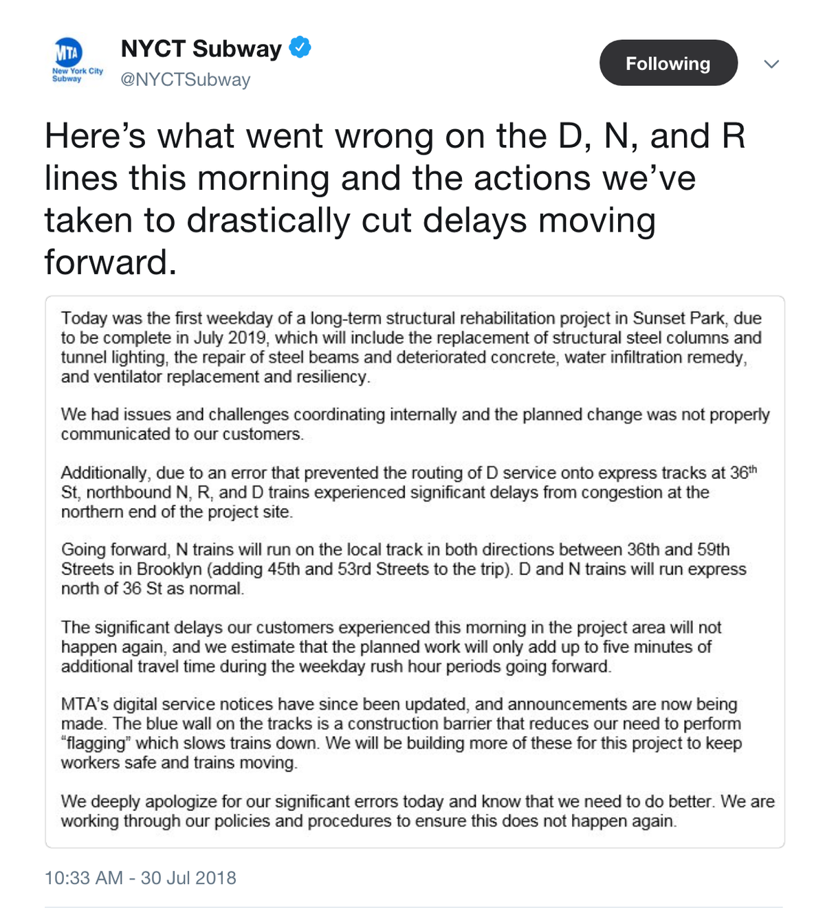 They did apologize, but that didn’t seem to be enough for some straphangers: “So you move ahead with a year-long project without telling ANYONE, including internal departments, and all we get is an apology?”