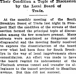 On June 2, 1900, a meeting held at Prospect Hall (263 Prospect Avenue, between 5th and 6th Avenue) discussed the rough conditions of South Brooklyn streets, including 6th Avenue, Prospect Avenue, and 8th Avenue, but officials from the city claimed there was “no money” for repairs.