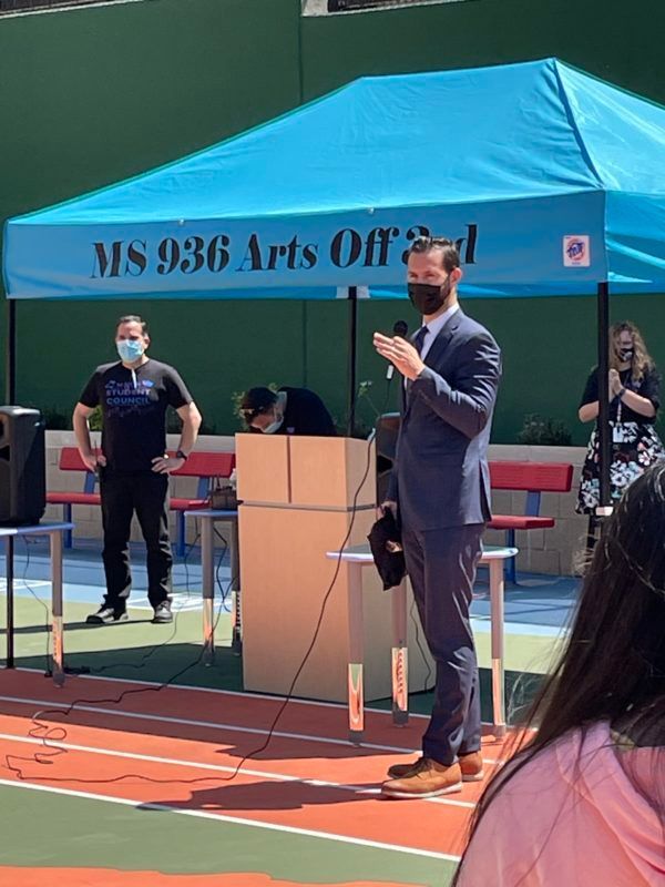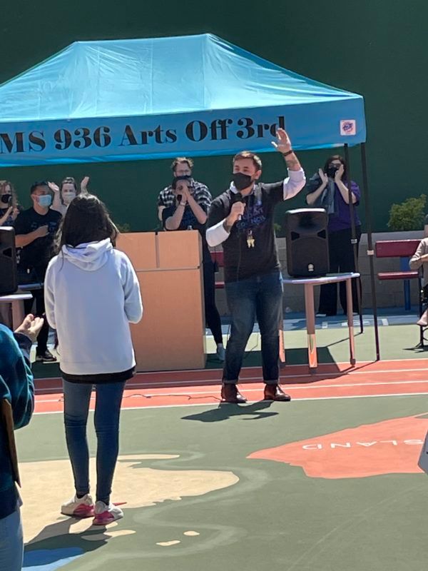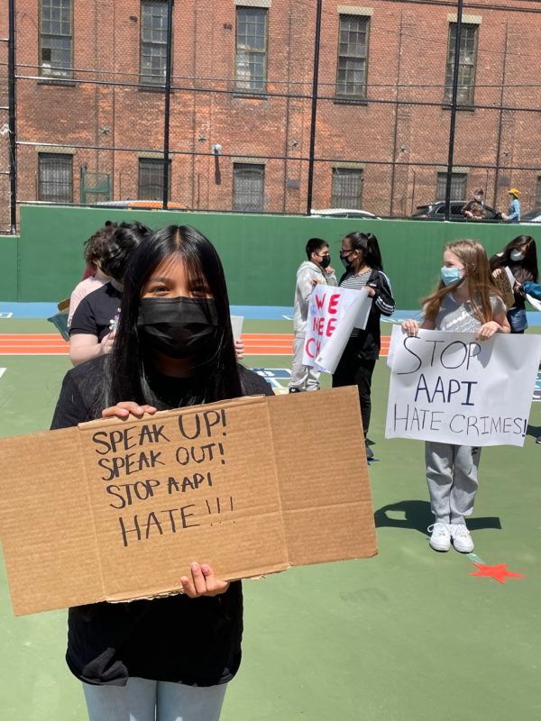 Known as “Arts Off 3rd”, because of its location at 3rd Avenue and 59th Street in the Mafalda DiMango Complex of the Arts, M.S. 936 is the first middle school in District 20 with a focus on visual and performing arts. It welcomed its first class this past September, with about 150 sixth graders. The class’s founding Student Leadership Council initiated the idea of holding a rally to support AAPI communities.