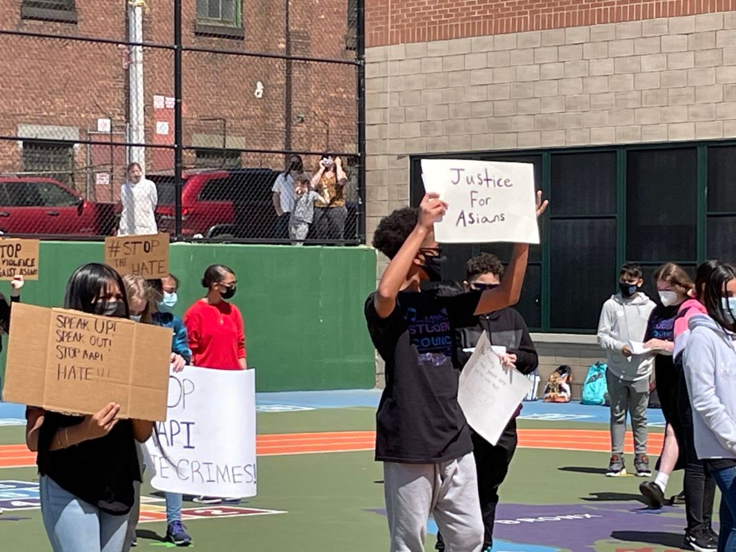 Tuesday afternoon saw nearly 35 students at M.S. 936 in Sunset Park gather in its schoolyard for an afterschool rally to denounce anti-Asian hate. The event was created by the school’s Student Leadership Council and was attended by faculty and staff, along with representatives of a few of Sunset Park’s community organizations.