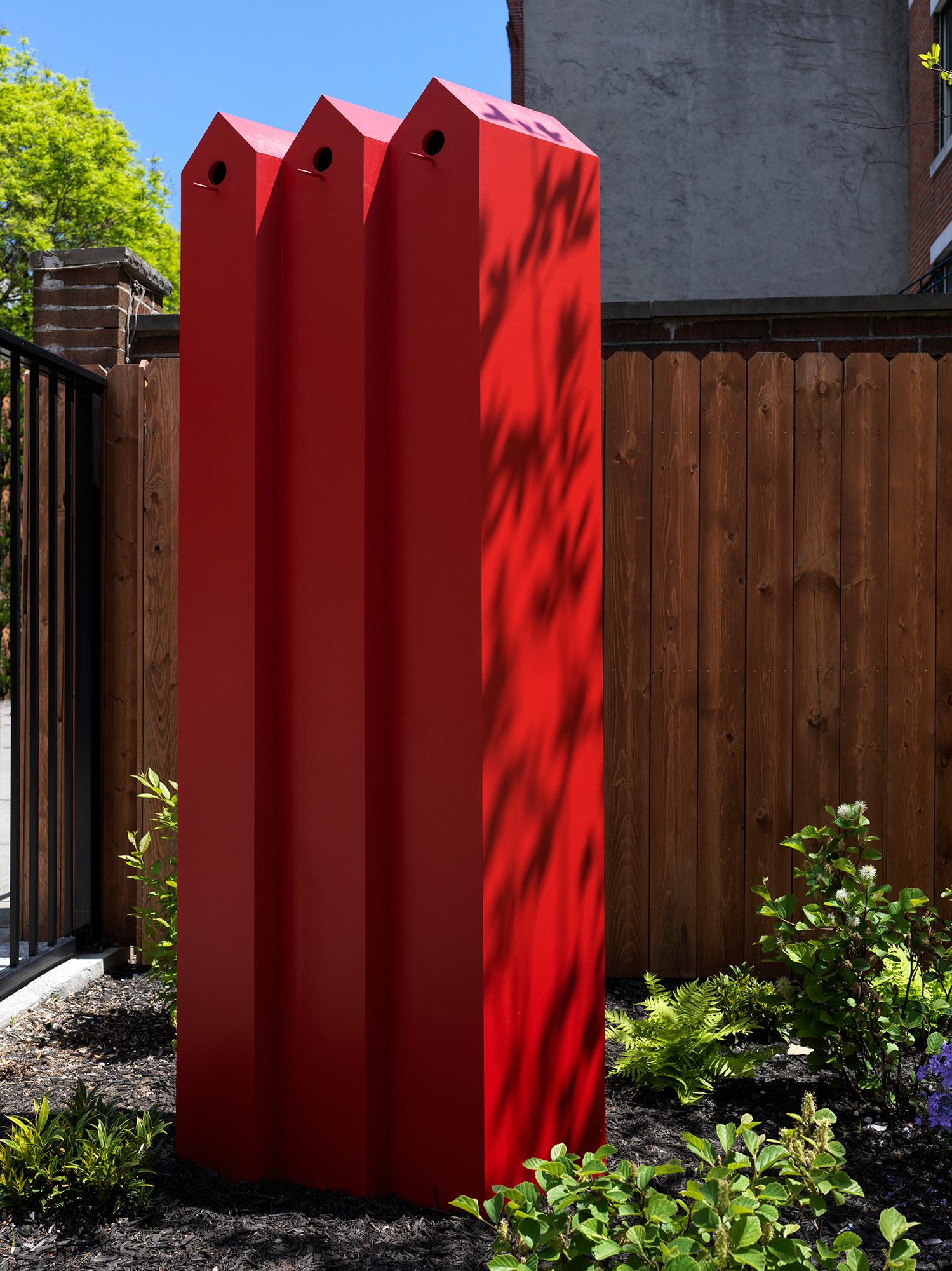 The piece For the Birds which consists of three tall, narrow bird houses constructed of red-painted plywood, explores a completely different kind of interaction; the idea emerged from artist Bailey Fontaine’s love of connecting with nature, said de Paola.