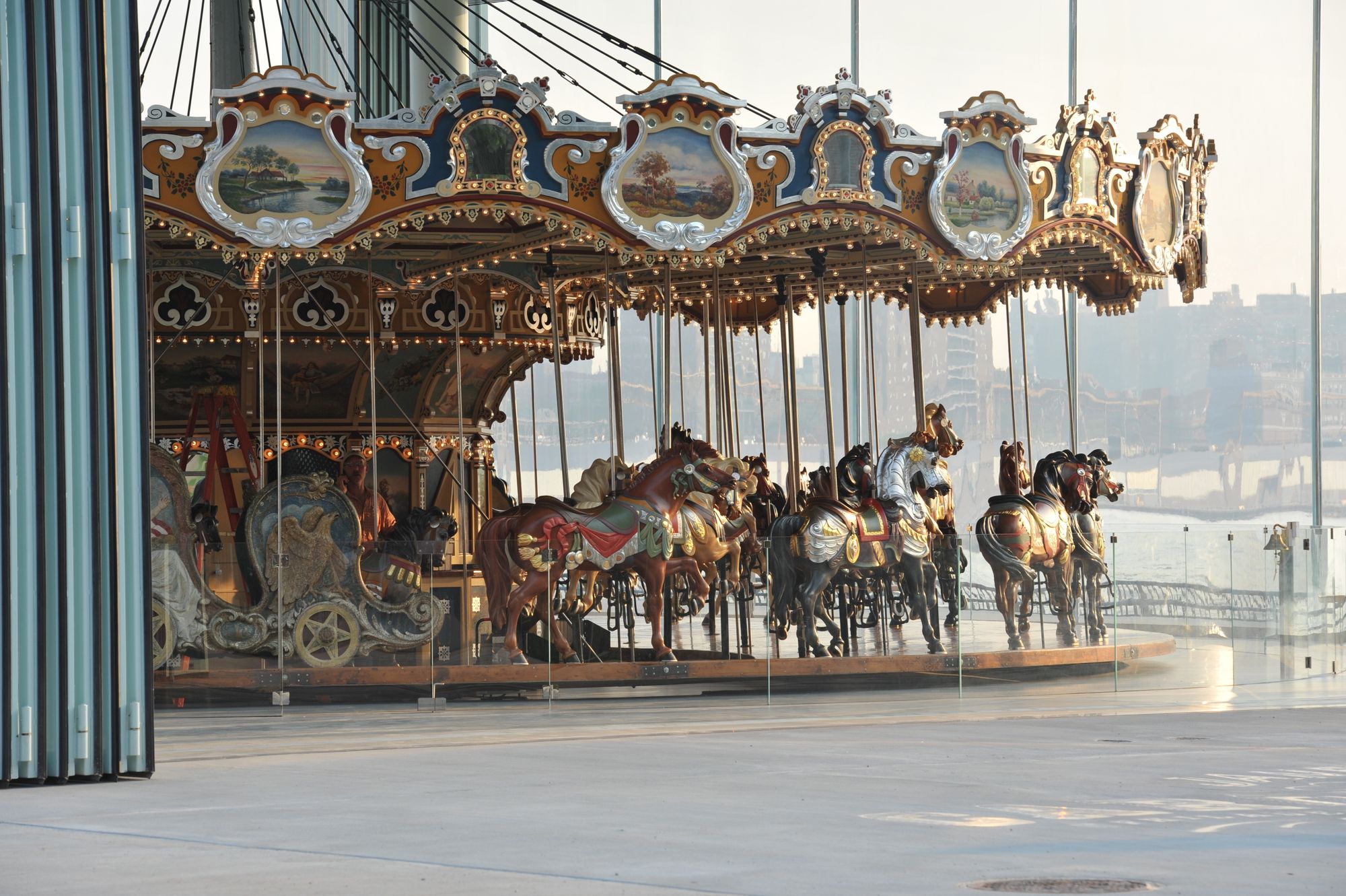 The carousel was built in 1922 by the Philadelphia Toboggan Company for Idora Park in Youngstown, Ohio. There are 48 horses and two chariots, featuring carvings by Frank Caretta, one of the country’s best master carvers, which helped place the carousel on the National Register of Historic Places. The Walentas family, who developed DUMBO, acquired the carousel in 1984 to put it in the Brooklyn Bridge Park.