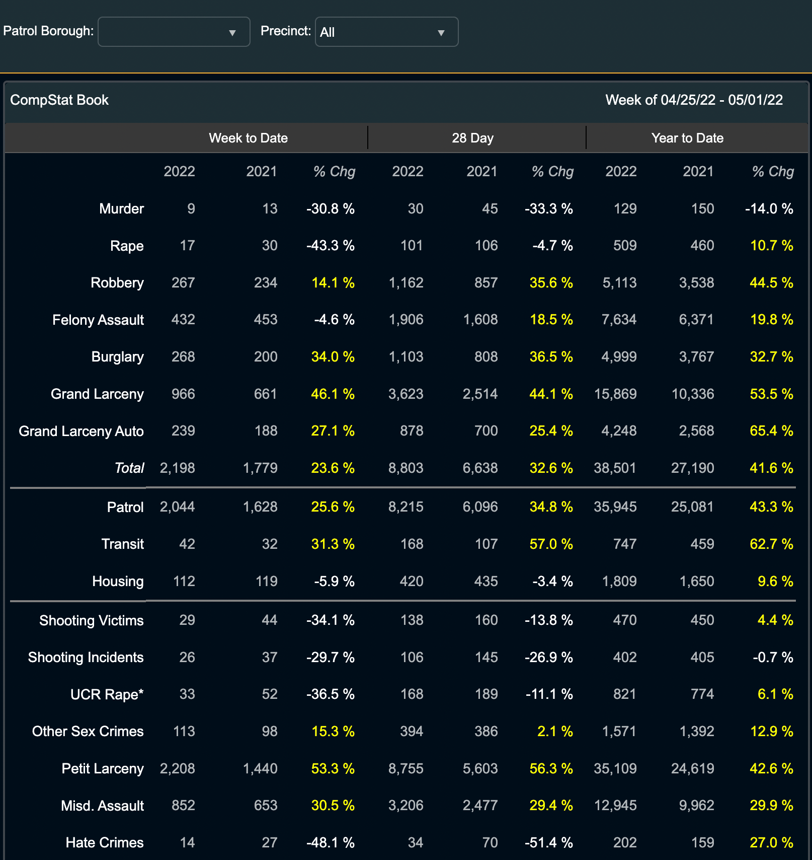 However, the public's unhappiness with how the Mayor is handling crime may be more because all the other major crime categories - assaults, burglaries, robberies, and such are up significantly and consistently across all parts of the city, affecting many more people. Reported crimes in the major categories were up 42% compared to last year and up 33% from just last month.
