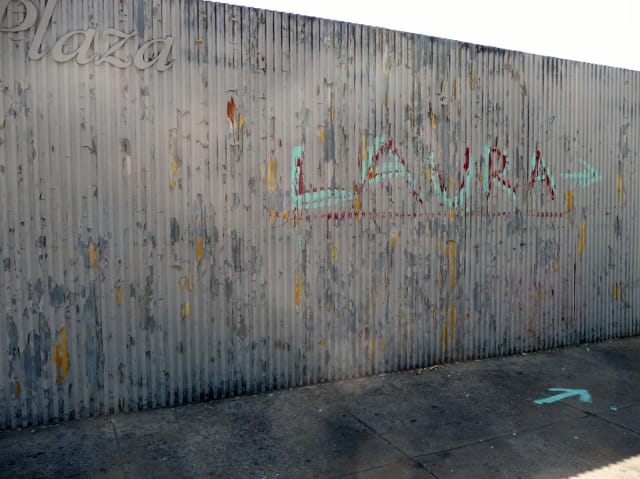 Someone had a message for Laura, and he decided to spell it out in paint, starting at the corrugated metal wall on the northern end of Newkirk Plaza.