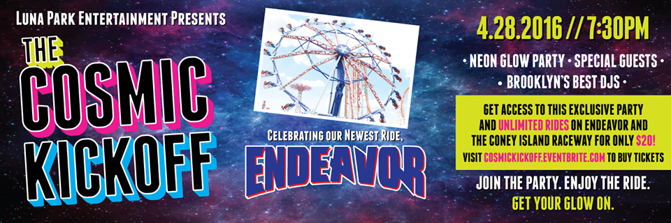 The “Cosmic Kick-Off party” celebrating the new ride will take place at 7:30pm. Besides the Endeavor, you’ll also get unlimited rides on the Luna Park Raceway, as well as the music, dancing and fun!