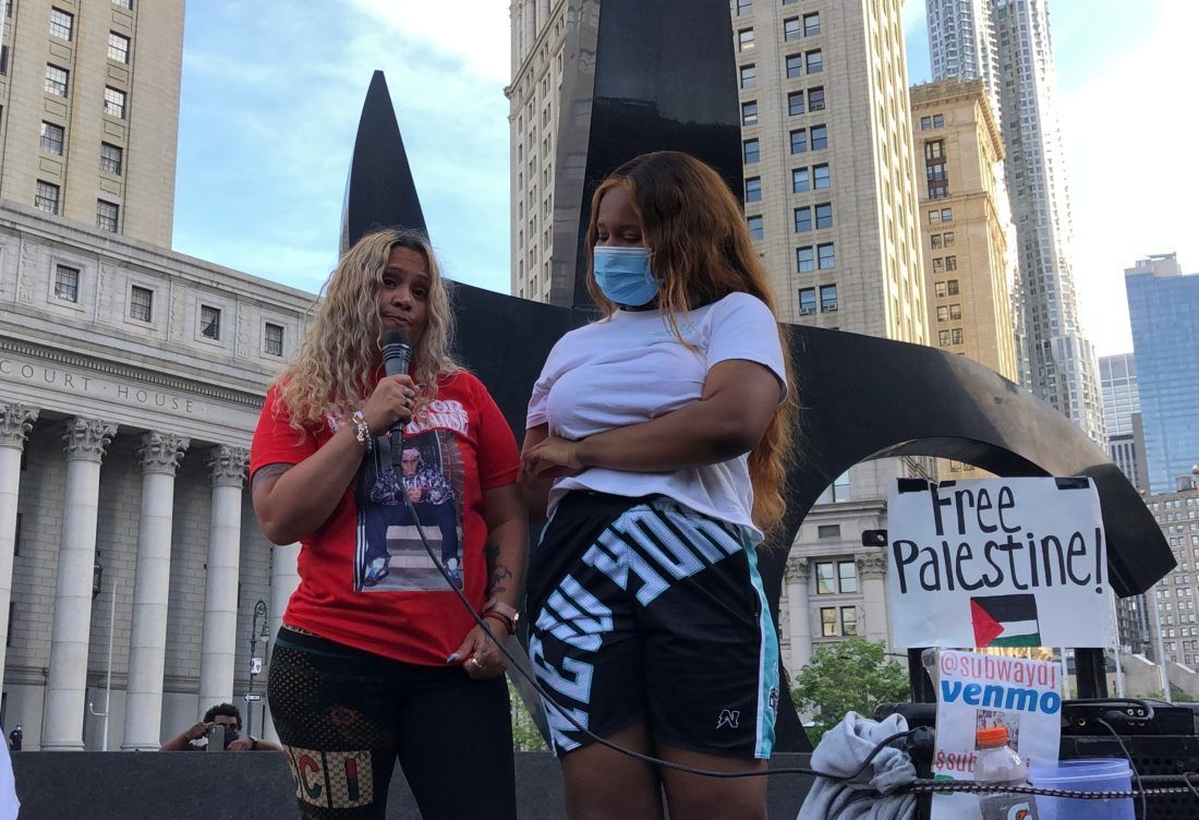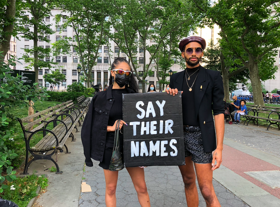 Courtney Wilson and D’Arel Miller hold a sign saying “Say Their Names” in a Foley Square rally.