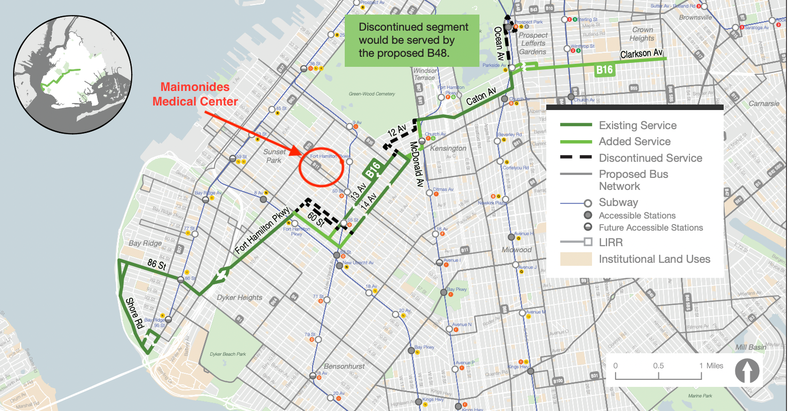 There is a proposal to reroute the B16 to 60th Street, which was rejected by Brooklyn CB 12 in 1978 and again in 2004 because 60th Street is more congested than 56th and 57th Streets. Both times the community countered with operating the B16 straight along Ft. Hamilton Parkway to pass Maimonides Hospital, which presently requires a long walk or transfer. That change would require changes to the B64.