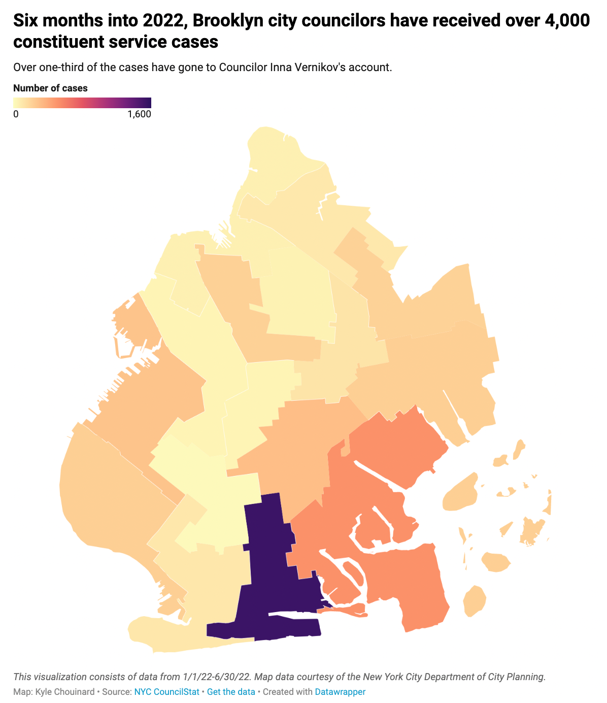 The data in the official tracker shows a marked decrease in cases recently, and it seems to be not because people need help from their council members less, but because many of them are choosing not to record the cases the way they are supposed to, with Inna Vernikov (R, Sheepshead Bay) possibly a lone standout.
