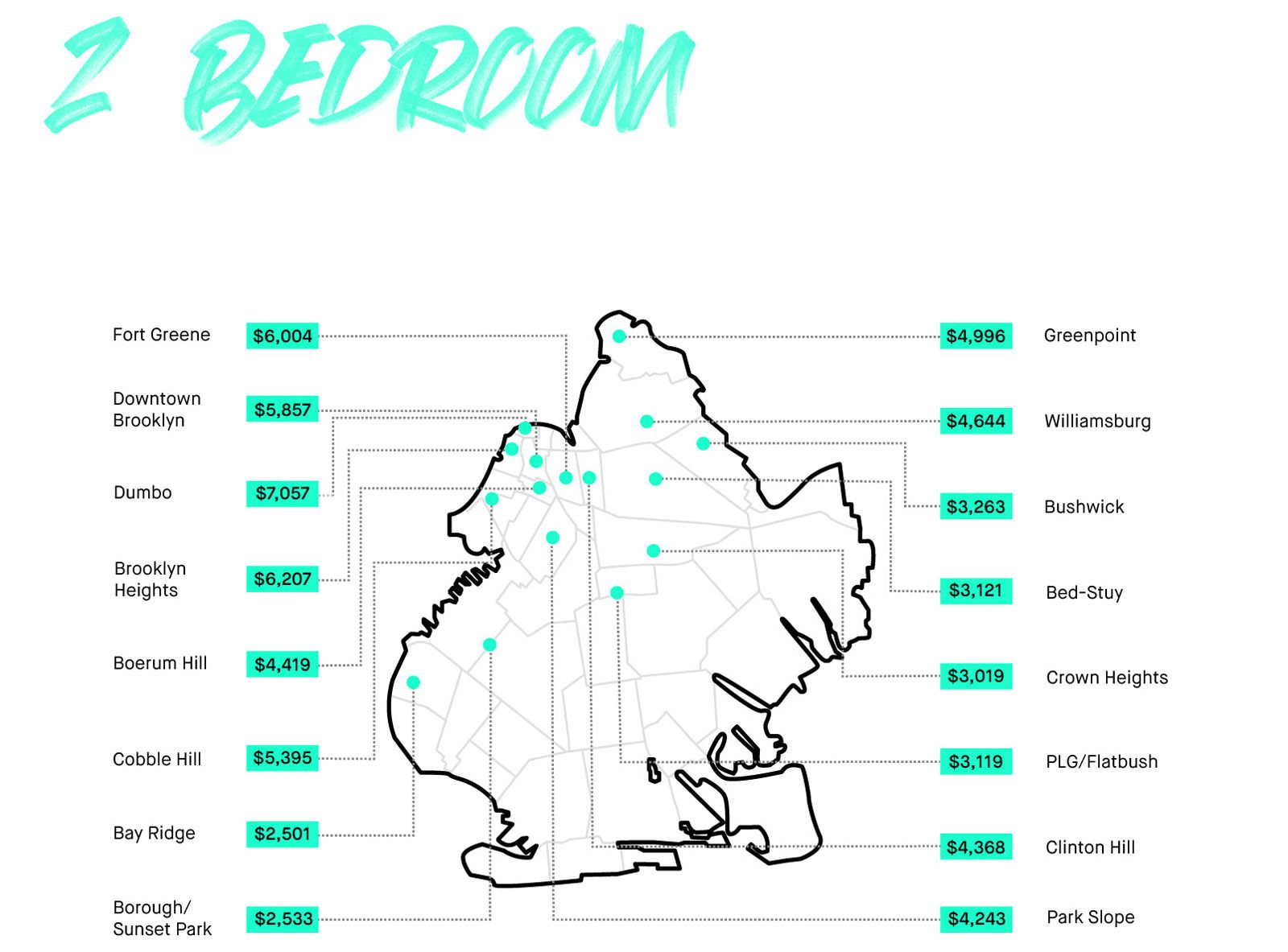 - Neighborhood with the largest month-over-month increase: Cobble Hill. Two-bedroom units in Cobble Hill are up 17.5%, from $4,591 to $5,395 in June 2022.