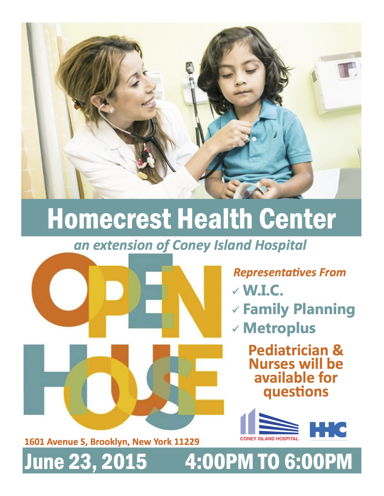 Homecrest Health Center, an extension of Coney Island Hospital, will be holding an open house on Tuesday, June 23 between 4pm and 6pm. Come meet representatives from WIC, Family Planning and MetroPlus. Our pediatricians and nurses will be available to answer your questions.