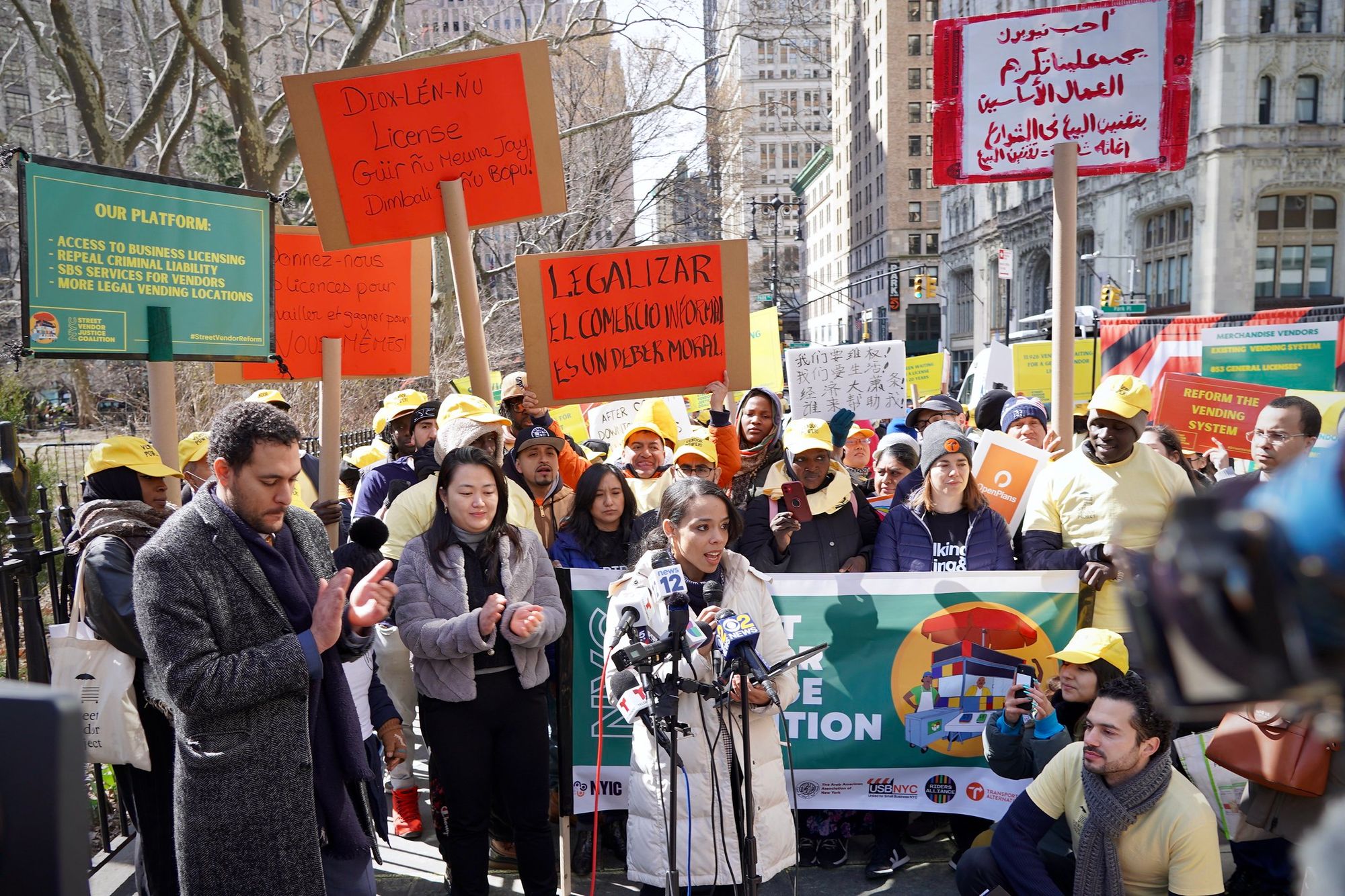 Street vendors rallied yesterday in front of City Hall, demanding legalizing their business. Legal street vending is currently very limited, and a tiny fraction of the estimated 20,000 vendors operate legally, whether it's churros or sunglasses they are selling in Atlantic Avenue subway tunnels or the boardwalk in Coney Island.