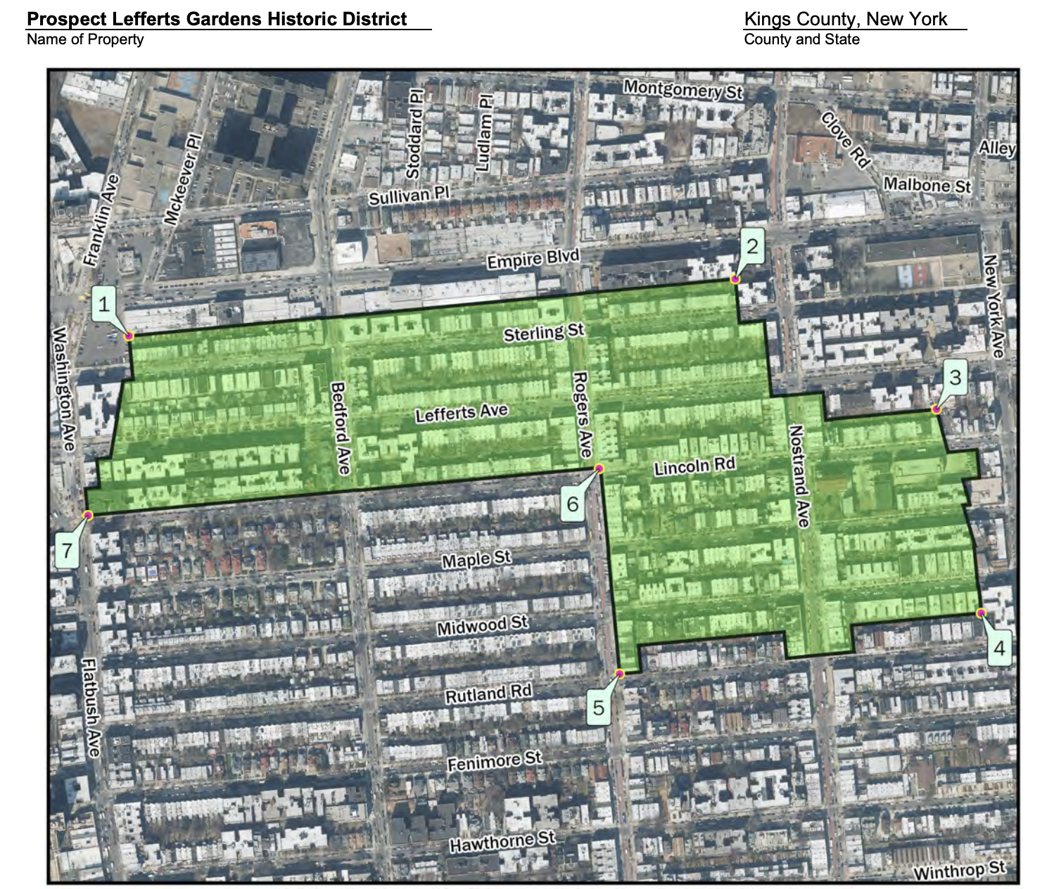 Prospect Lefferts Gardens Historic District's boundaries are Sterling Street to the north, Lincoln Road and Rutland Road to the south, and Flatbush Avenue to the west. They extend eastward to be ween Nostrand Avenue and New York Avenue from Rutland Road to Lefferts Avenue. "The Prospect Lefferts Gardens Historic District, as delineated herein, overlaps with and extends east and west of the existing Prospect Lefferts Gardens Historic District, designated by the New York City Landmarks Preservation Commission in 1979."