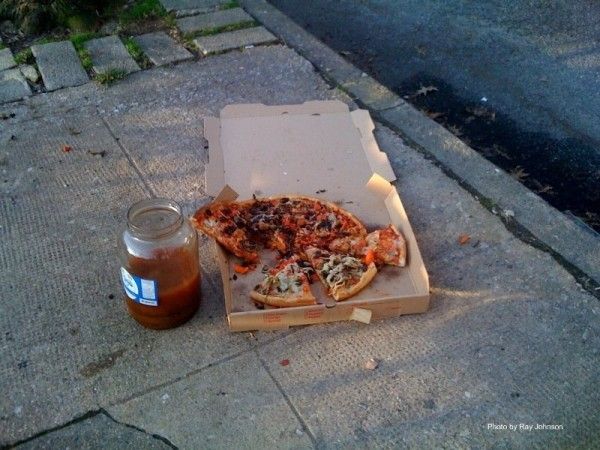 Leftover pizza for breakfast can be a real treat, but this Thursday morning leftover is no such thing. In Brooklyn, where pizza is practically worshipped, leaving a pie on the streets might be considered blasphemous. But to top it all off, children on their way to school at P.S. 254 were forced to look upon this horrendous sight.
