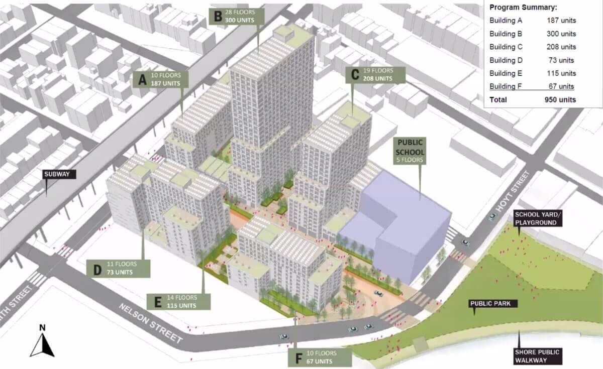 The proposed Gowanus rezoning is projected to permit the creation of 8,495 new dwelling units; 2,000 would be below-market rate through the city’s Mandatory Inclusionary Housing program, and another 950 would be city-sponsored affordable housing units at a proposed development at the Gowanus Green site. The majority of that housing will be priced for households making between $30,000 and $100,000 per year.