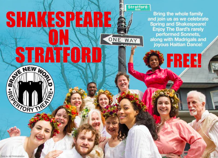 Brave New World Repertory Theatre’s SHAKESPEARE ON STRATFORD Spring FestivalSunday, April 28, 2pm to 4pmOutdoors on Stratford Road (between Cortelyou Road & Slocum Place)