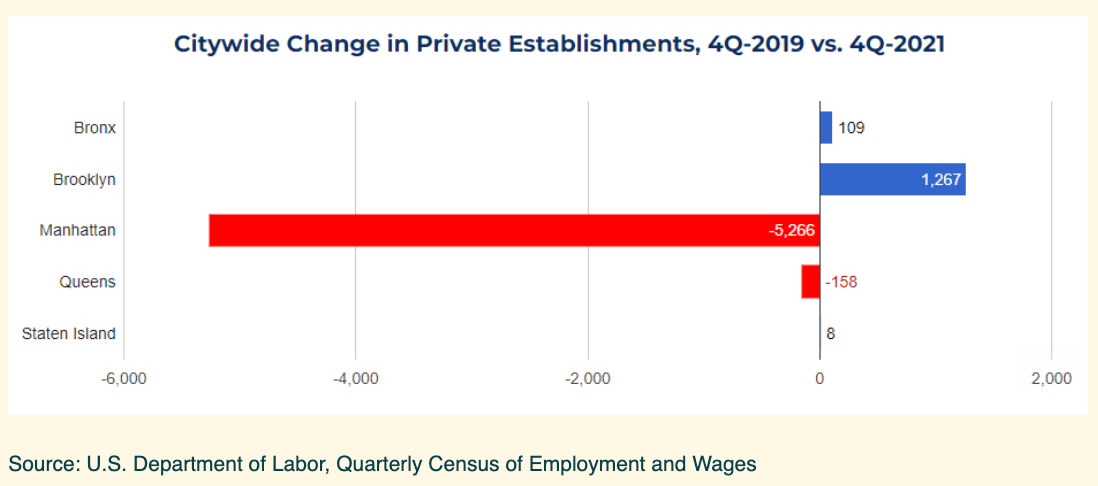 Manhattan lost businesses while Brooklyn saw new ones open, and more interesting data was released by Comptroller Brad Lander's office. Brooklyn now accounts for almost a quarter of all of the city's private establishments.