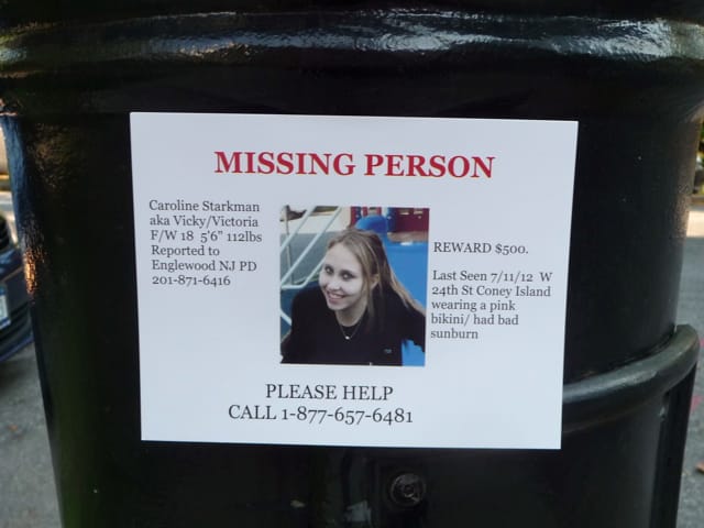 We saw some flyers up around the area about 18-year-old Caroline Starkman, aka Vicky or Victoria, who was reported missing to the Englewood, NJ Police Department. She was last seen on July 11 on West 24th Street in Coney Island, wearing a pink bikini and with a bad sunburn.