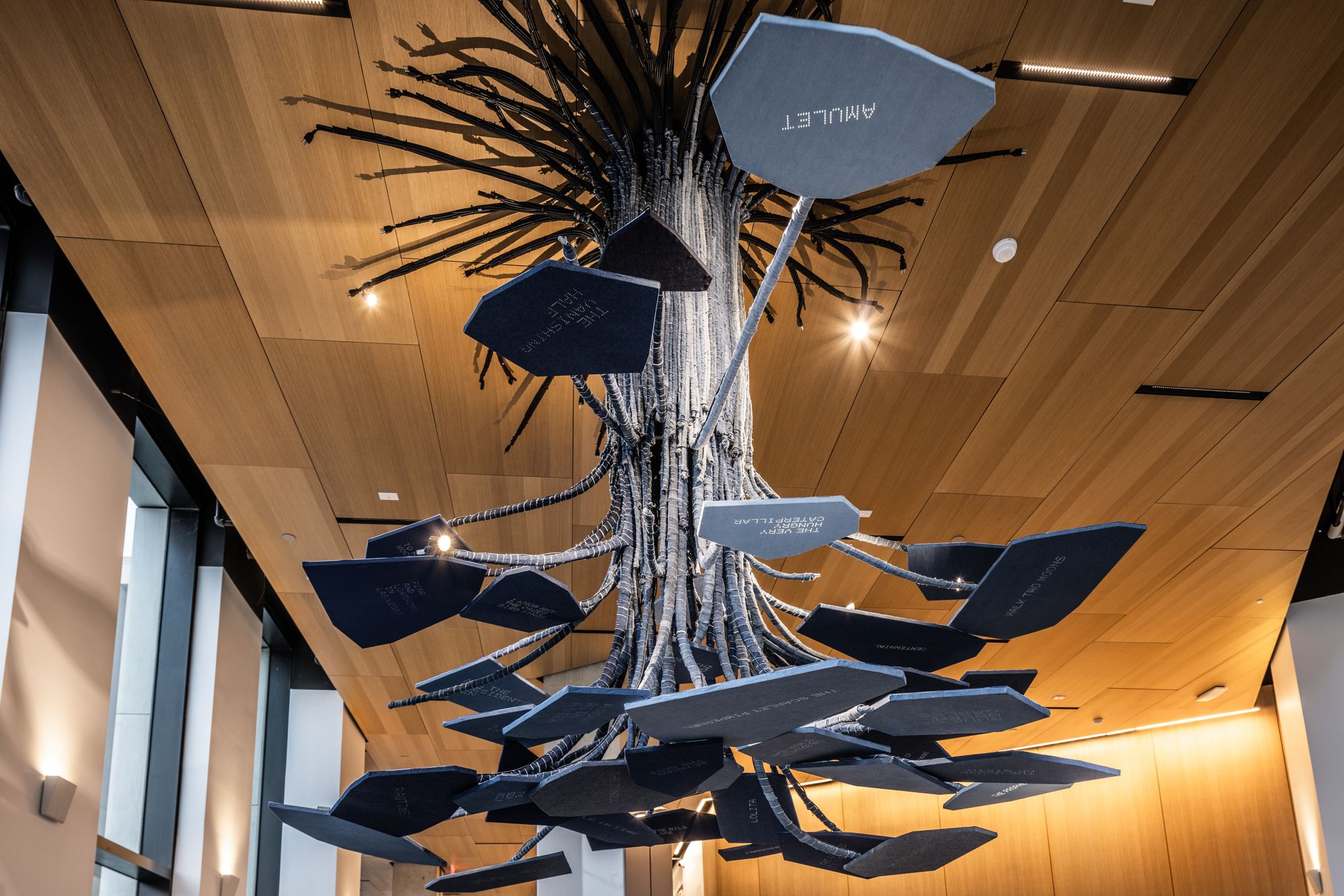 The sculpture, an illuminated, inverted hanging tree with roots at the ceiling, draws on the tree's symbolism as a sacred symbol of knowledge and its role as the source of paper for books.
