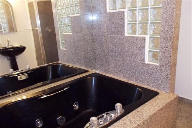 Details: Just a couple of blocks over, this bright rental boasts a large kitchen with brand new dishwasher, microwave and storage, jacuzzi tub (shown above) “that fits 2” (wink, wink, nudge, nudge), separate shower, and an oversized walk-in closet.