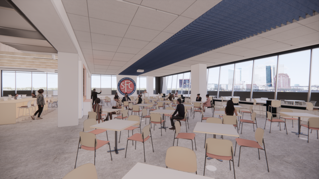 The new facilities prioritize collaboration and community and will feature flexible labs and classrooms with built-in technology that accommodate a range of teaching styles and class structures, a 300-seat auditorium, a 260-seat cafeteria, a 32-seat tiered screening room, a 6,600-square-foot library with study and research spaces as well as the outdoor terrace and access to a roof deck, two art gallery spaces and other gathering spaces for students to work together, study and relax, St. Francis college shared. The new campus does not include a gym or pool on site, and the College is developing partnerships with nearby institutions to share indoor spaces for practice sessions and competitions for its athletics program.