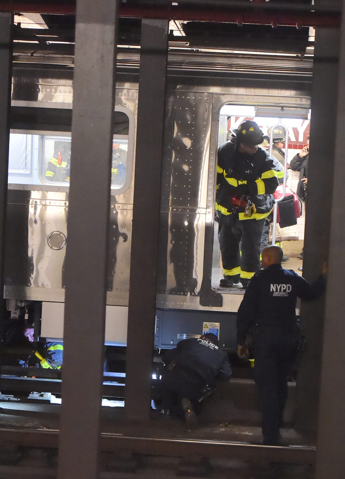 Emergency workers try to recover the body of the man under the train at Rockaway Avenue and Fulton Street. Todd Maisel/Bklyner