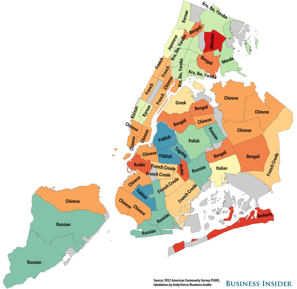Image courtesy of Business Insider [http://www.businessinsider.com/nyc-non-english-language-maps-2014-8].Is English your native language? No? What about Spanish? Well, it turns out that — to just about no one’s surprise — these are the top two languages spoken in Brooklyn homes, according to data from the U.S. Census Bureau’
