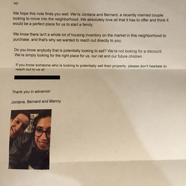 Photo courtesy of A Fort Greene Resident.Have you ever received a letter like this? A homeowner on Vanderbilt Avenue between Myrtle and Park Avenues received this letter inquiring as the availability of their house — or the homes of anyone else they know in Fort Greene — in their mailbox on
