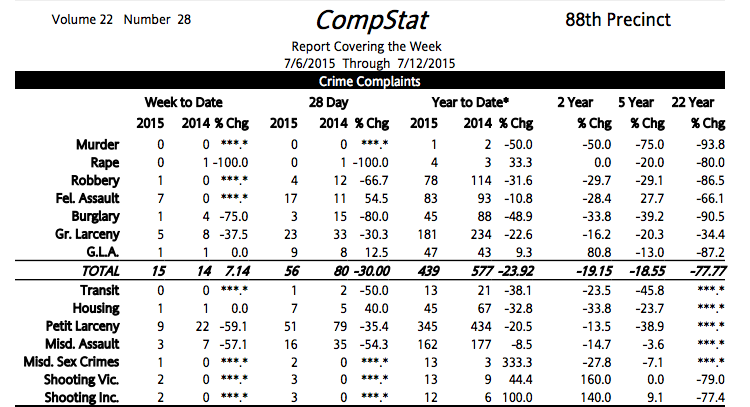 Image via NYPD.The second week of July (July 6-12) saw a reversal of the previous week’s (June 29-July 5) [/blog/2015/07/14/88th-precinct-crime-statistics-petit-larcenies-jump-four-fold-while-felony-assaults-fall-in-the-first-week-of-july/] rises and falls of crime statistics — the categories that saw fewer crimes last week [/blog/2015/07/14/88th-precinct-crime-statistics-petit-larcenies-jump-four-fold-while-felony-assaults-fall-in-the-first-week-of-july/] saw more this week, and