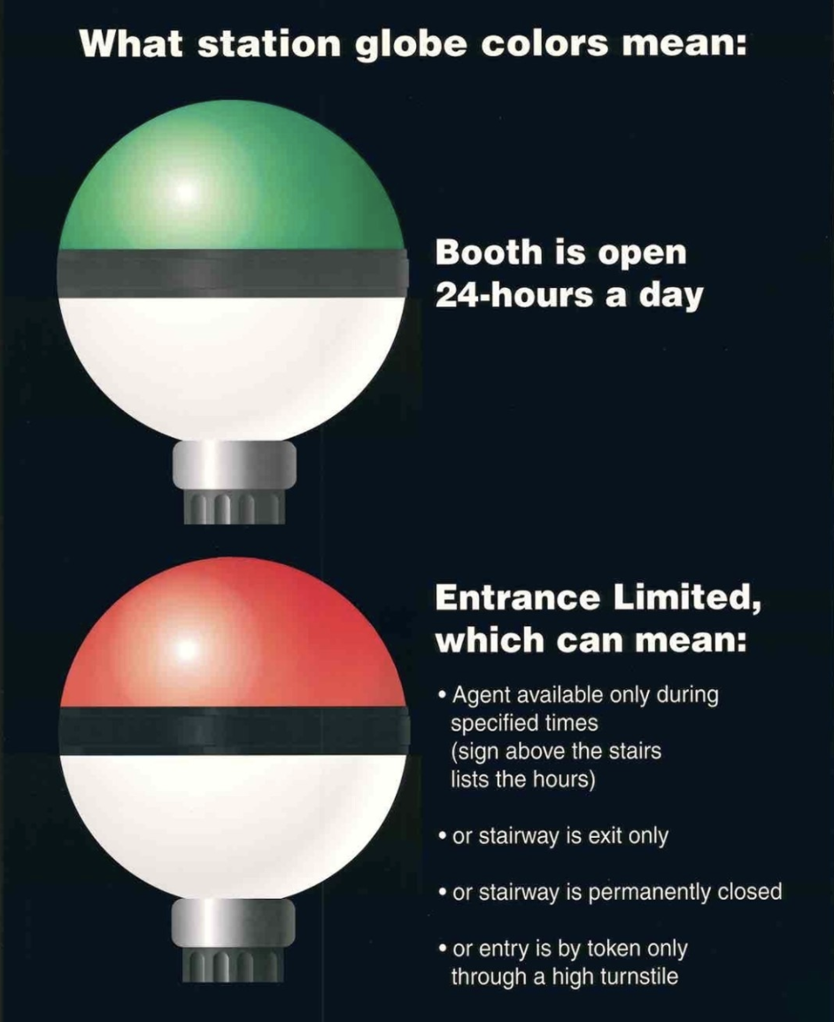 "Color-coding of entrance globes began in the early 1980s to help customers determine which entrances were open and had a manned booth. Originally, green indicated a 24-hour token booth, yellow meant a part-time booth, and red meant entrance limited or exit only. Yellow lights were later discontinued for simplification and after the introduction of the MetroCard and installation of High Entrance and Exit Turnstiles (HEET), exit only indicators were no longer needed." Via @nytransitmuseum.