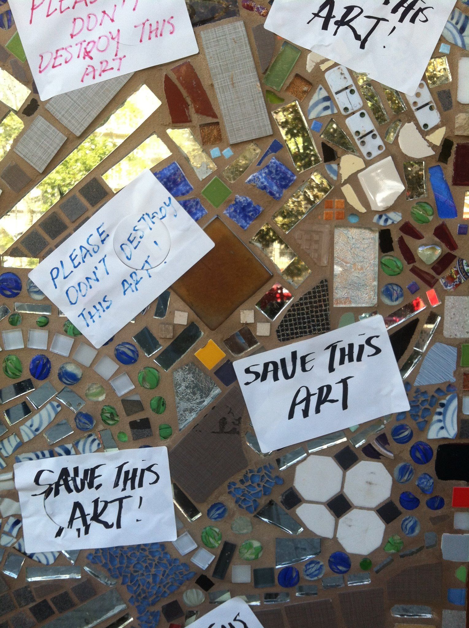Brooklyn Recycle artist Juan Carlos Pinto put signs on the mosaic to try to prevent the construction workers from tearing it down and many concerned neighbors reached out to the medical practice to urge them to save the piece.