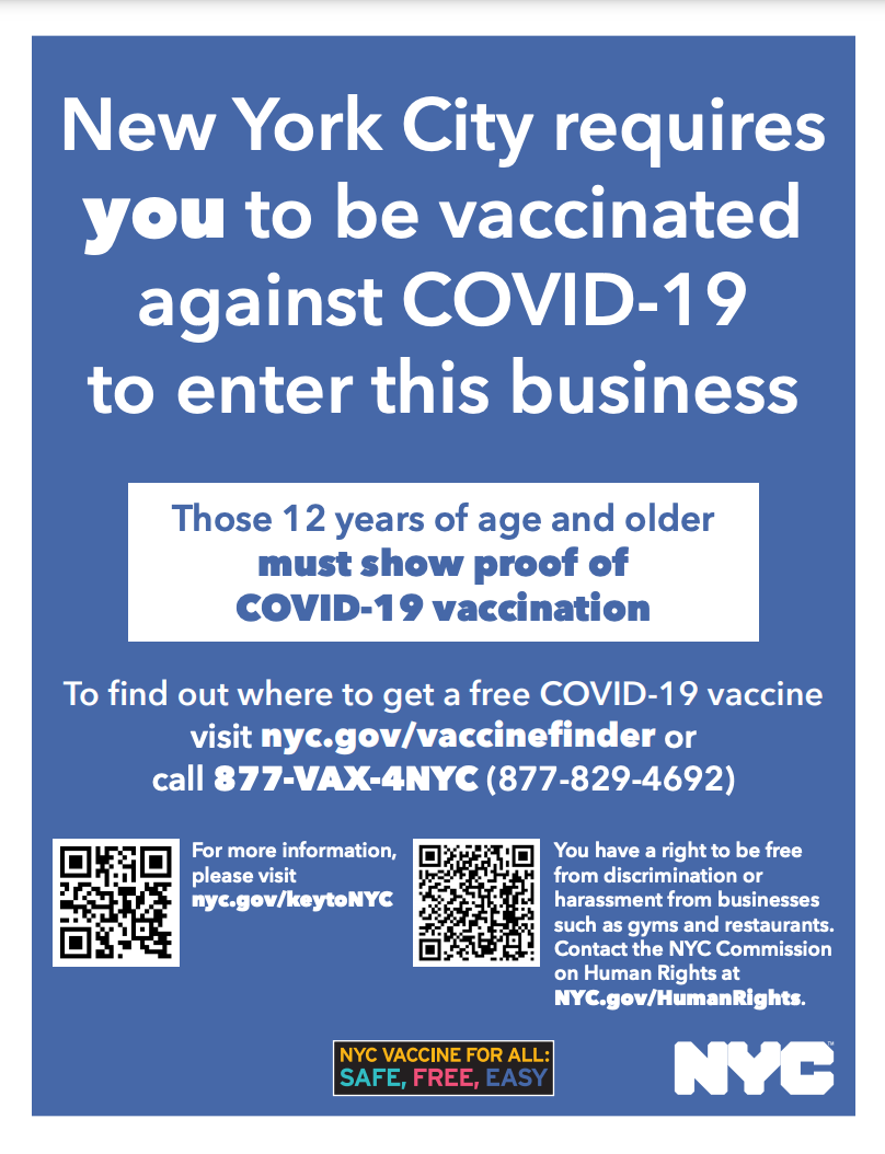 Employees, patrons, interns, and volunteers at Key to NYC establishments must display proof of vaccination. Contractors working with Key to NYC establishments who are residents of New York City must also display proof of vaccination.