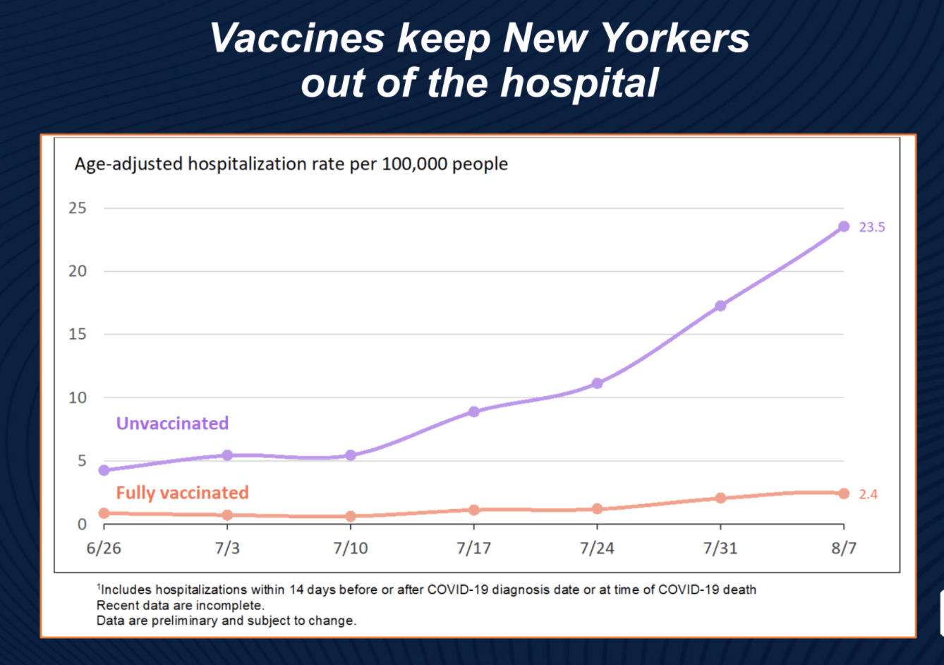 Data collected between January and August across the city shows that of fully vaccinated New Yorkers, only 0.33% were diagnosed with COVID, and 0.02% were hospitalized, and only 0.003% died. 96.9% of COVID hospitalizations across the city are unvaccinated individuals, Dave Choksi, NYC Department of Health Commissioner informed. Â It is possible that more than 0.33% of vaccinated people got COVID over that time period, had no symptoms, and did not get tested.